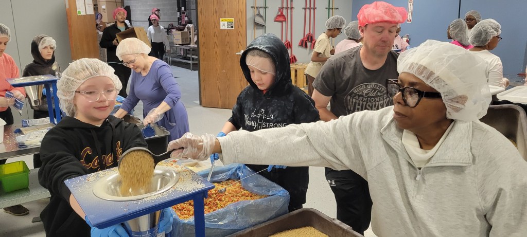 Feed My Starving Children May 6. Packing to feed 75 children for a year. Immanuel helping others.